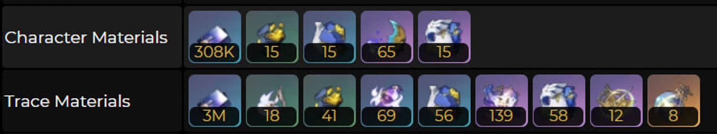 Для полного возвышения персонажа Трибби с 1-го до 80-го уровня и максимальной прокачки всех талантов (Следов) вам потребуется собрать следующие материалы.