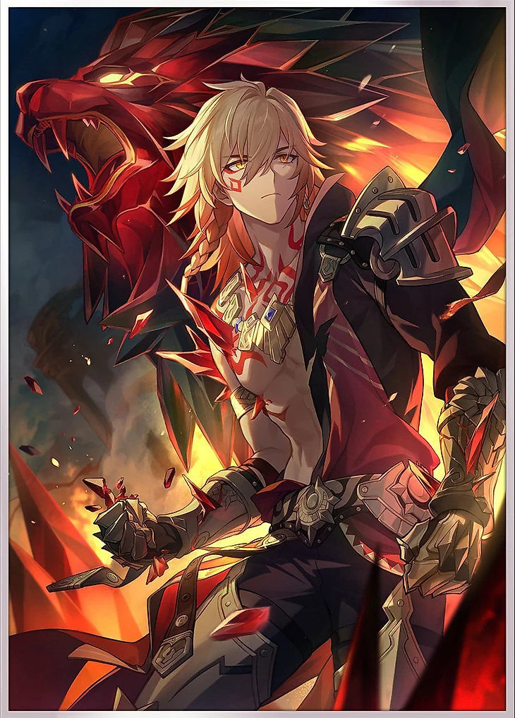 «Flame of Blood, Blaze My Path». Повышает макс. здоровье владельца на 18% и исцеление на 20%. Когда используется навык или сверхспособность, поглощает 6% здоровья и увеличивает наносимый урон на 30%. Если этот эффект поглощает более 500 здоровья, дополнительно увеличивает наносимый урон на 30% (то есть нужно целых 8400 здоровья!).