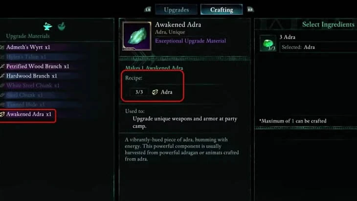 В системе крафта существуют особые правила работы с адрой. Хотя базовую форму создать невозможно, более совершенные виды доступны для синтеза. Например, три кристалла обычной адры на станции улучшения в лагере можно преобразовать в один кристалл Пробужденной адры.