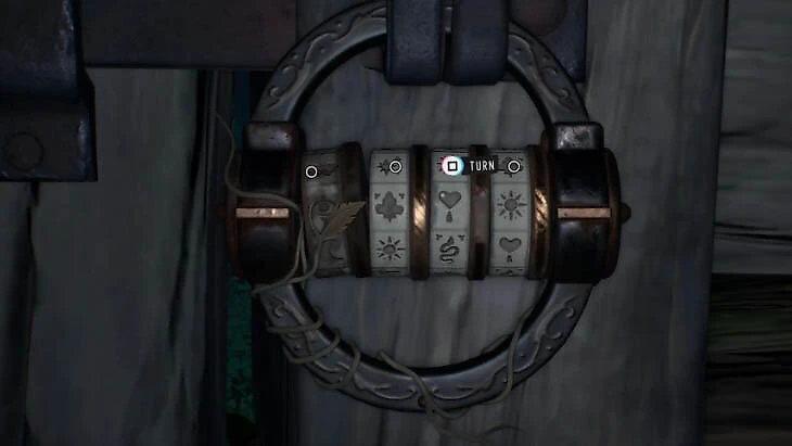 Для открытия замка требуется правильно расположить четыре символа. Первый символ уже зафиксирован и является верным. На одной из балок хижины игроки найдут бумагу, прикрепленную ножом, которая указывает расположение всех символов. При этом в хижине намеренно размещены ложные подсказки.