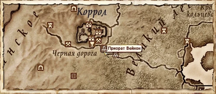 Приорат Вейнон (Weynon Priory) находится на юго-восточной окраине города Коррол, одного из крупных населенных пунктов Сиродила. Уже на этапе выхода из подземелий Имперского города локация приората будет отмечена на карте, и у игрока появится два варианта, как туда добраться.