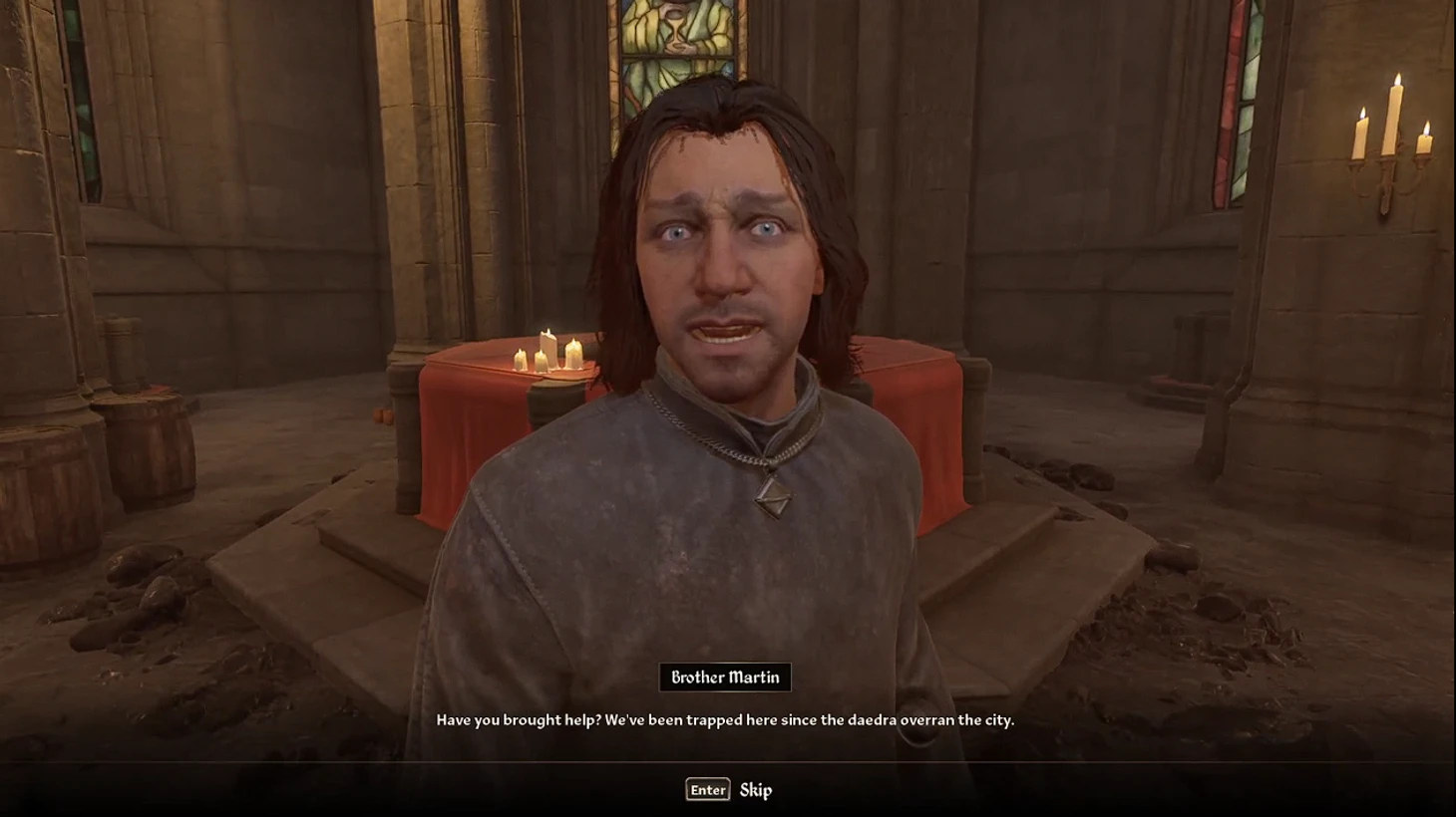 Вы можете спокойно пройти мимо ворот Обливиона и зайти в город. На площади перед часовней будет несколько даэдра, с которыми достаточно легко разобраться. После этого можете спокойно зайти в часовню и пообщаться с Мартином. И хотя он будет сильно удивлен известию о своей биографии, он откажется идти с вами в приорат Вейнон, пока вы не закроете врата Обливиона и не очистите город.