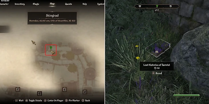 После успешного побега встретьтесь с Амузаем на свободе. Он выполнит своё обещание и укажет, где спрятана книга. На вашей карте появится маркер — идите за городскую стену Скинграда, к дому Нерастарела. За домом, рядом с колодцем и кустом, вы найдёте книгу «Lost Histories of Tamriel».