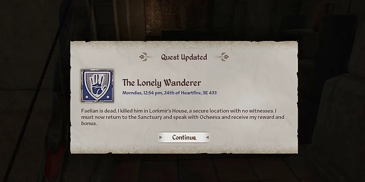 Как сказала Очива, убийство должно быть совершено без свидетелей. Для этого Фэлиан должен умереть внутри здания «Дом Лоркмира» в Эльфийских садах, и в момент смерти поблизости не должно быть NPC (включая стражу, горожан, даже крыс, если они считаются «свидетелями» по механике игры). Убийство в «Тайбер Септим», на улице или при свидетелях лишит вас уникального лука «Теневая охота». В итоге у нас остается два варианта.