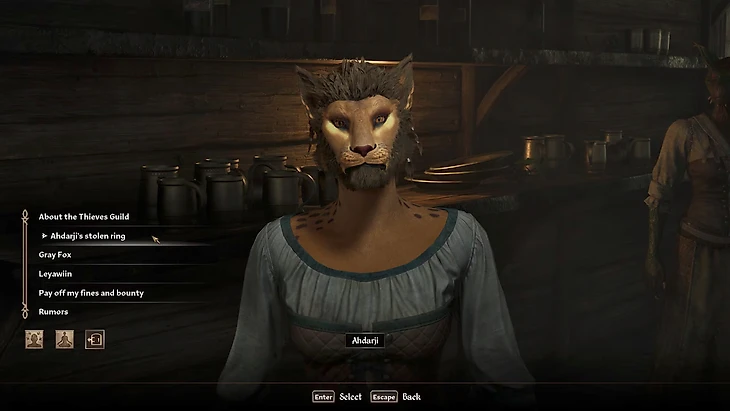 Адарджи расскажет, что ее кольцо украл аргонианин по имени Амузай (возможно вы с ним уже знакомы). После разговора с каджиткой Адарджи, ваша цель – найти аргонианца Амузая.