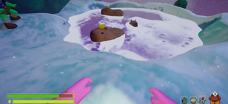 Капибары – единственные животные, которых можно встретить на острове PEAK во время путешествия. Среда обитания забавных грызунов – зона Альпийских лугов, третий по счету биом с холодным и снежным климатом. Живут грызуны около горячего источника – места, согревающего морозным ветрам и снежным бурям этого региона.
