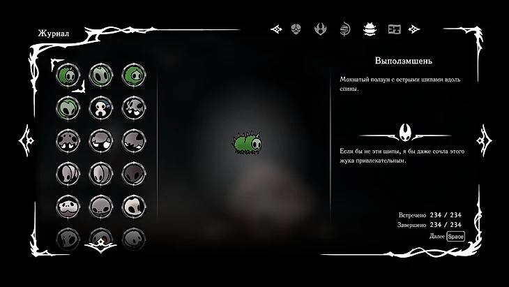 Полный журнал в Hollow Knight Silksong включает более 230 существ и боссов, обитающих в разных областях Фарлума. Чтобы получить все записи в журнале, необходимо исследовать каждую локацию и побеждать всех врагов, включая редких и квестовых. Ниже приведен список по регионам.