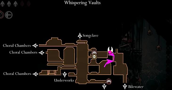 Придется проникнуть в «Белые покои». Оказавшись в высокой шахте, аккуратно спланируйте вниз, стараясь избежать встречи с шипами. В туннеле, который уходит влево, вас ждет награда. А чуть ниже вы обнаружите кратчайший путь к «Звонкому узлу».