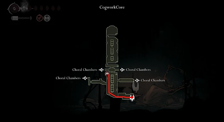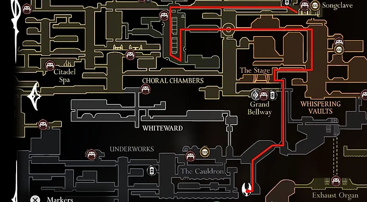 Спрятан рядом с лавочкой возле Архитектора. От лавочки пройдите вправо и спрыгните вниз. Сломайте деревянные подпорки (балки) на левой стене ударами Иглы или Искусством, чтобы открыть скрытый проход.