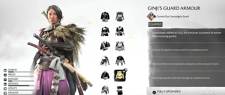 Броня Стража Гиндзи – ситуативный вариант, полезный в редких случаях. Она увеличивает скорость перезарядки танэгасимы (мушкета), что делает ее отличным выбором для игроков, активно использующих огнестрельное оружие.
