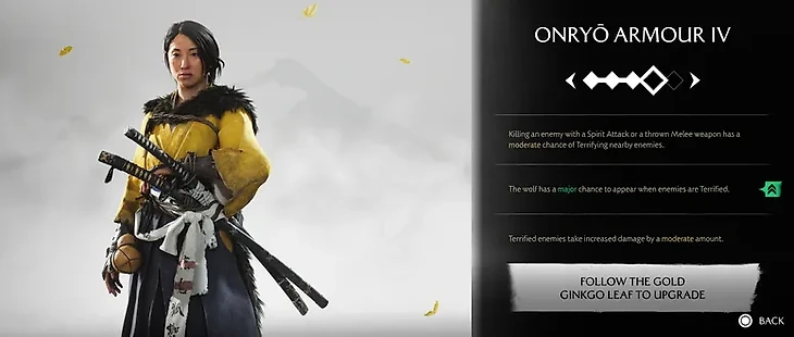 Улучшение брони не требует кузнеца – чтобы повысить уровень, нужно проходить золотые миссии мести (Gold Revenge Quest Cards), отмеченные значком золотого листа гинкго. На втором уровне броня получает три способности: шанс напугать врагов при атаке духом или метательным оружием и повышение урона по испуганным целям.
