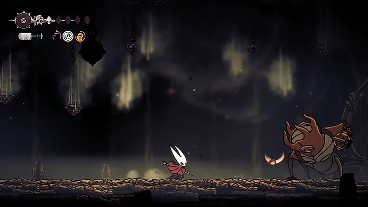 После открытия всех скамеек и победы над мини-боссом Великими ракушечными мухами двигайтесь налево, к хижине Булавочницы. Здесь вы получите новый навык и сможете отдохнуть. Далее возвращайтесь к станции Звонкого пути и идите направо, спускаясь вниз к большой арене с пилигримами и судьями.