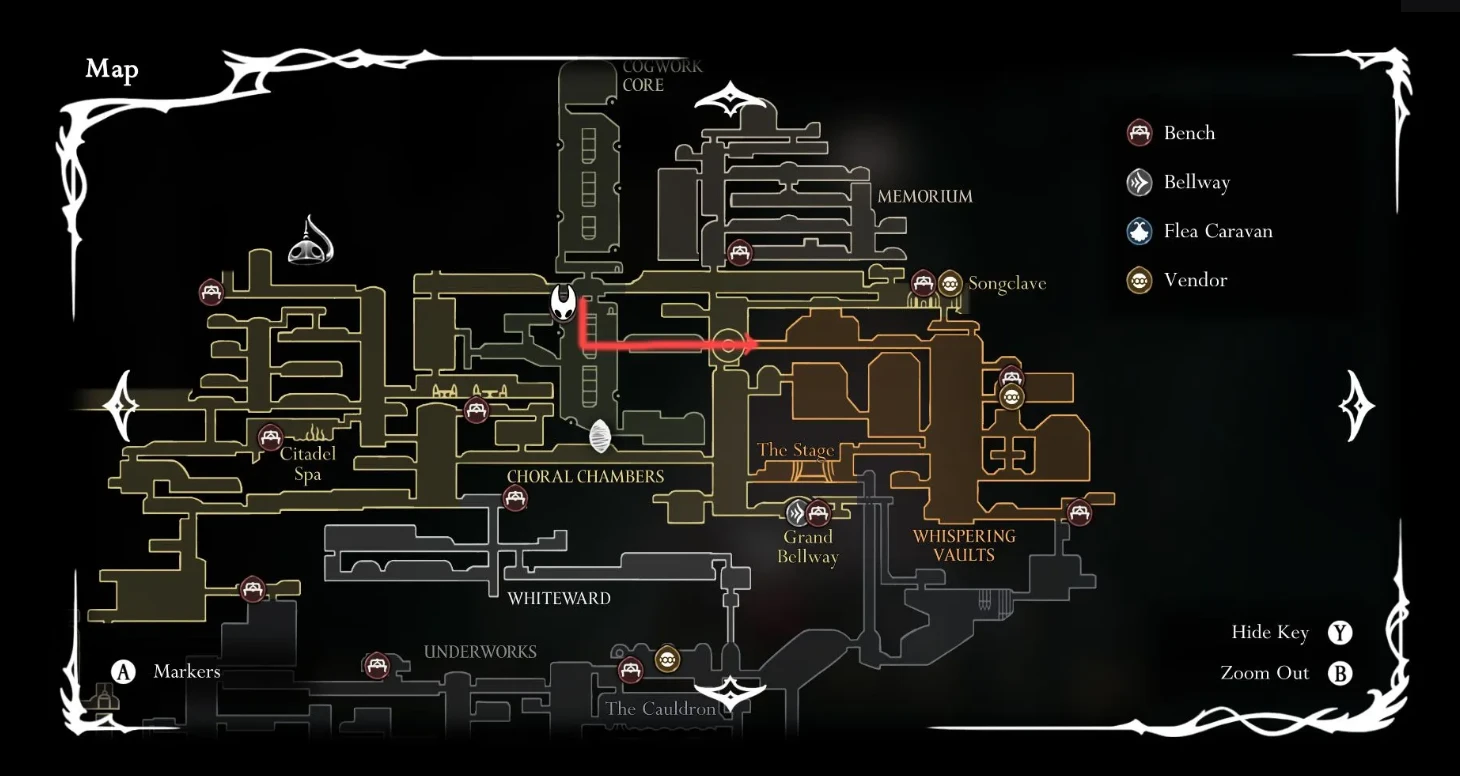 Шепчущие катакомбы в Hollow Knight Silksong – это сюжетное задание во втором акте игры. Чтобы попасть в закрытую локацию вам необходимо отправиться в Главный механизм Цитадели и там найти восточный коридор. Далее используйте путь к Мелодии Архитектора, но не доходите до конца. В нижней части механического ядра находится выход с правой стороны.