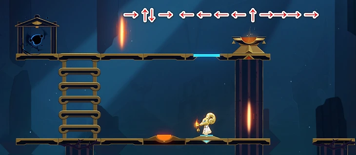 Отойдите немного вправо от края платформы, затем спрыгните и спуститесь вниз по лестнице. Необходимо выполнить 2 цикла движений, смещаясь поочередно влево и вправо, после чего занять позицию на оранжевой кнопке – это активирует порталы. Преодолейте лестничный подъем, проникните в открывшийся проход и устремитесь к священному алтарю – лишь так вы сможете пройти испытание до конца.