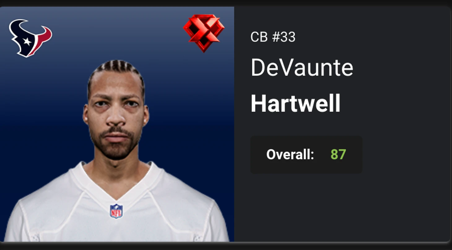 1) DeVaunte Hartwell, CB, HOU, OVR 84-87, X-Factor – Nah.