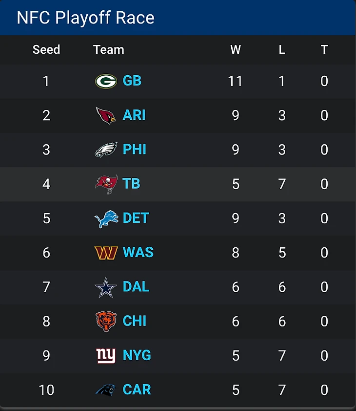 Команды, которые будут пытаться занять последнее, 7 проходное место в плей-офф. Это команды из NFC: Чикаго, Даллас и Вашингтон. Надёжнее всего в этой компании чувствует себя Вашингтон, который обладает положительным балансом побед и поражений и в данный момент занимает 6 строчку таблицы. Любопытно, что если бы с таким результатом, команда была в другой конференции, то она рисковала бы не попасть в плей-офф вообще. Даллас одержал победу над Нью-Йорком и будет дальше пытаться цепляться за плей-офф. Что касается Чикаго, то помимо сильного дивизиона, про который я писал в предыдущем пункте, Артур совершенно не может найти свою игру. Однако, если Чикаго-таки доберётся до плей-офф, это будет самый опасный соперник с низким посевом.