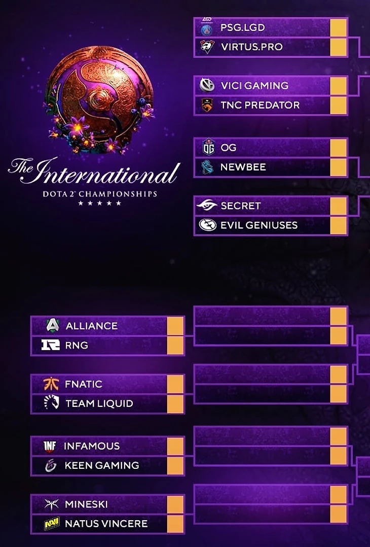 6:00. Верхняя сетка. PSG.LGD – Virtus.pro8:30. Верхняя сетка. Vici Gaming – TNC10:40. Нижняя сетка. Alliance – Royal Never Give Up12:30. Нижняя сетка. Fnatic – Team Liquid13:30. Нижняя сетка. Infamous – Keen Gaming17:10. Нижняя сетка. Mineski – Natus Vincere