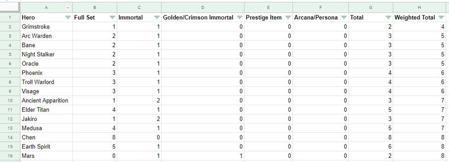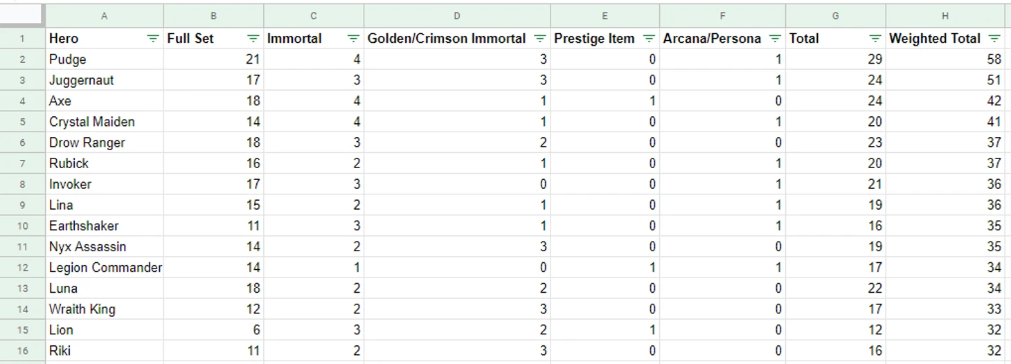 После окончания Инта всегда наступает период, когда в мире Доты ничего не происходит. Поэтому фанаты развлекают себя сами. К примеру, юзер Реддита под ником Anomalina89 выложил таблицу, в которой посчитал общую ценность всех косметических вещей каждого из 117 героев в Доте. Зачем? А чтобы определить, какой герой сильнее всего нуждается в новых шапках.