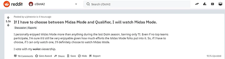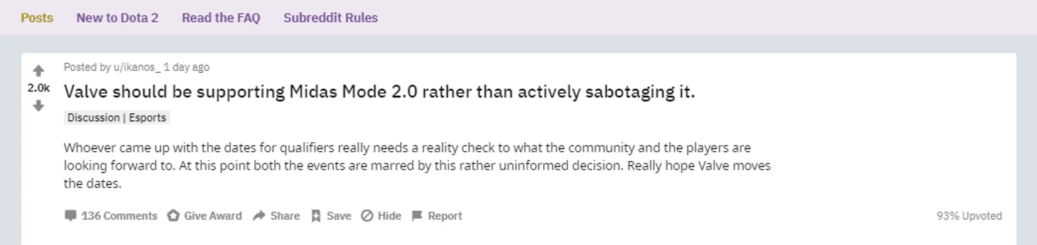 Дата первых квалификаций на мейджор и майнор (30 сентября – 5 октября) совпадают со временем проведения Midas Mode 2.0 (24 сентября – 2 октября). Из-за этого команды не примут участие в любимом турнире Реддита. На самом Реддите уже появилась петиция о переносе квалификаций, а пользователи публикуют посты в поддержку Midas Mode: