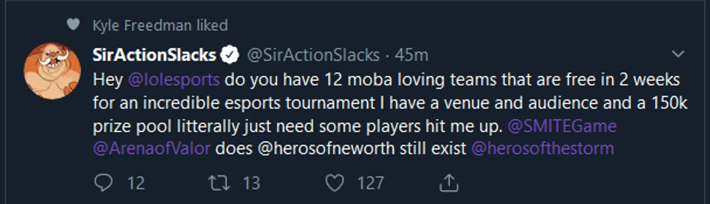 «Хей, Лига Легенд, у вас есть 12 команд, которые будут свободны на 2 недели для замечательного турнира? У меня готово место проведения, есть аудитория и призовой фонд в 150 тысяч. Просто нужна парочка игроков».
