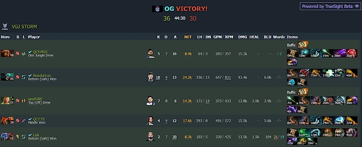 Пару дней назад, при обсуждении этой статьи, коллега спросил меня: «А разве Морфлинг – ненадежный герой?». На третьей карте OG – PSG.LGD Yuragi дал исчерпывающий ответ. В этой игре у OG, начиная с линий, было огромное преимущество как по золоту, так и по стратегической инициативе. Снесенная нижняя сторона, 9 тысяч преимущества – и это против Алхимика! Но все это неважно, когда твой керри – Морфлинг. Yuragi убили несколько раз (из-за перекачки в ловкость), а OG потеряла все преимущество и отправилась в нижнюю сетку.