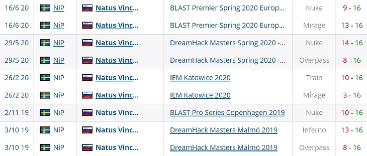 Матчап между NAVI и NiP продолжает быть самым односторонним на CS:GO-сцене. В последний раз шведская команда побеждала Natus Vincere в Bo3 еще в сентябре 2017-го – почти три года назад. С этого момента «ниндзя» постоянно проигрывают NAVI, причем чаще всего с разгромным счетом.
