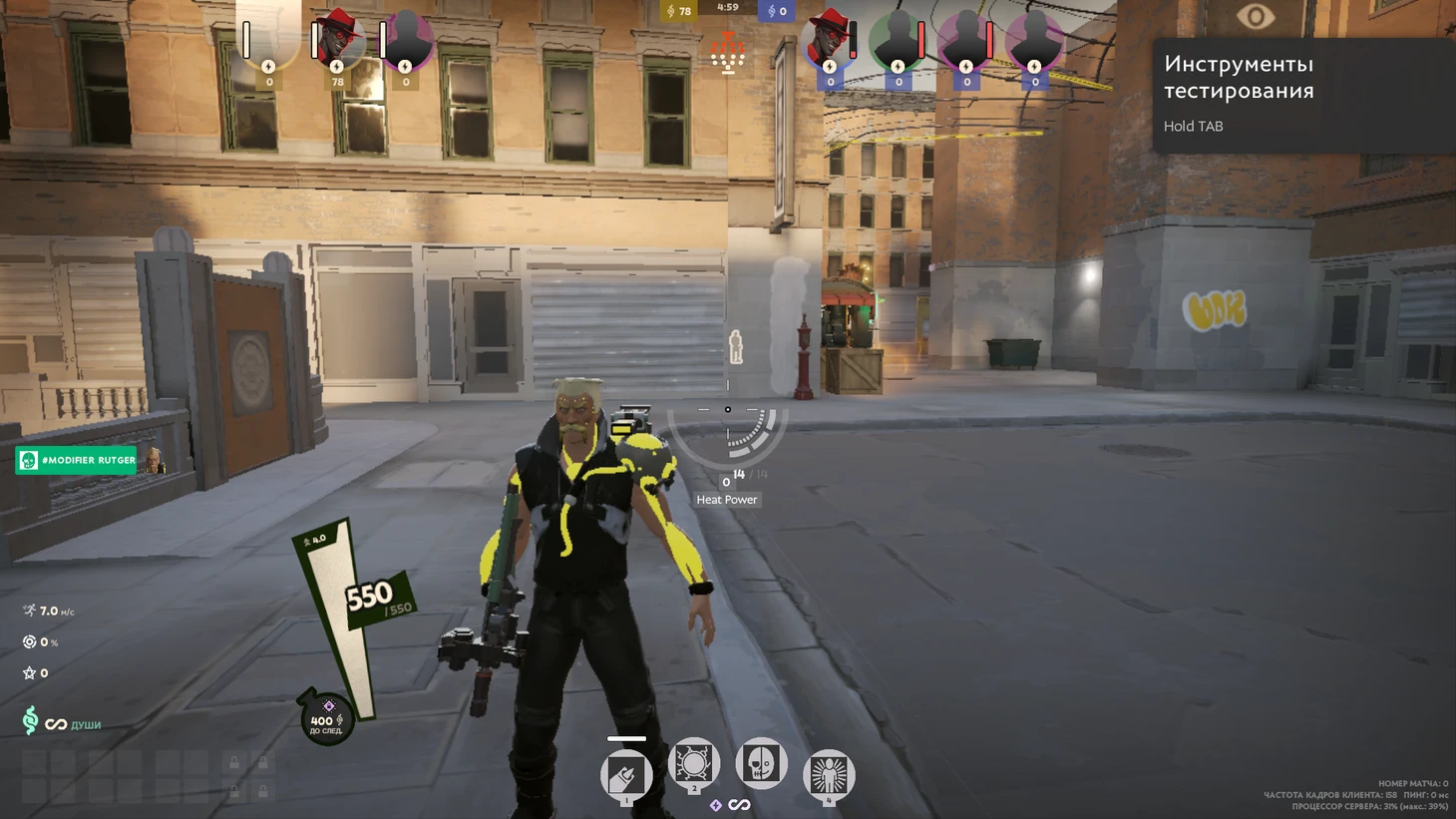 Усатый мужчина с ярко желтыми трубками по всему телу. Возможно, это какие-то кибернетические модификаторы тела. Его тяжело убить, так как при снижении количества здоровья до минимума на Рутгера накладывается щит. Умения героя основаны на отталкивании врагов снарядами, а самый мощный скилл понижает скорость передвижения и наносит массовый урон.