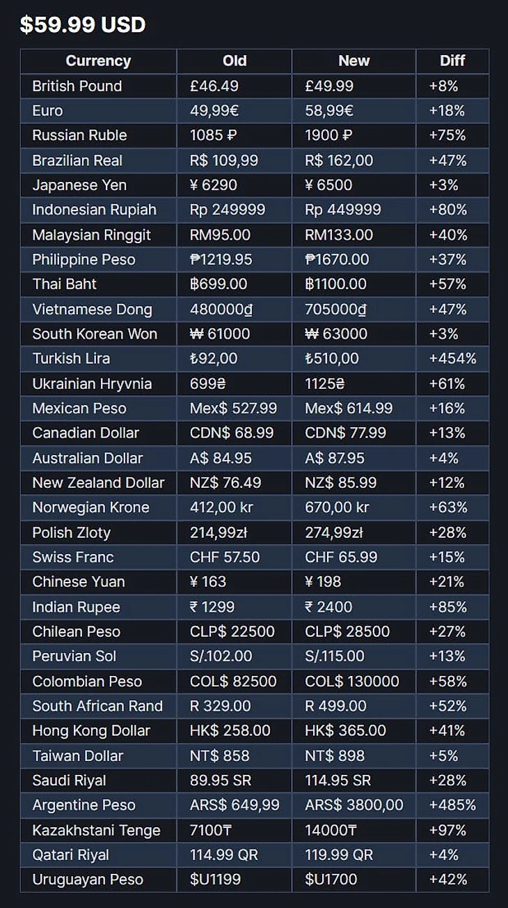 Ценники давно не обновляли, но сегодня рекомендованные региональные цены резко взлетели. Стоимость зависит от базовой цены релиза в долларах США.