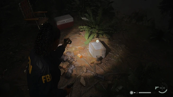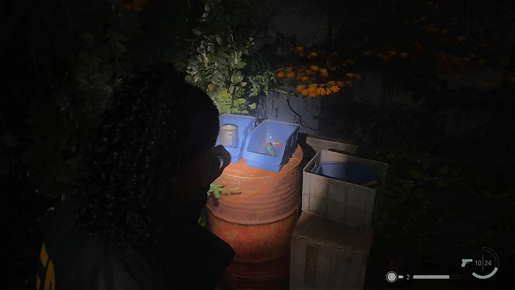 Развернитесь и идите по мостику, в конце которого виднеется синий ящик. Рядом с ним лежит перегоревший предохранитель. Двигайтесь вперед, и у импровизированного места отдыха вы найдете патроны и блокнот с записями. Отсюда – налево: там есть беседка и красная бочка, на которой лежит работающий предохранитель!