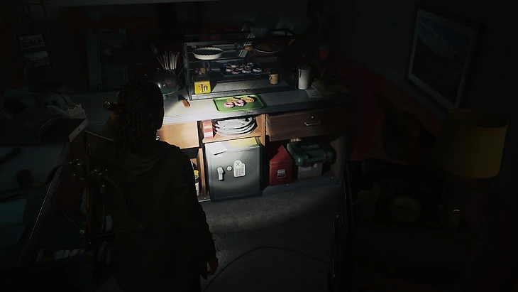 Отоприте дверь, за которой комната отдыха. Напротив входа находится важная доска, где прикреплены карты всех схронов культа, расположенных в Брайт-Фоллс, Уотери и территории у озера Колдрон! После изучения комнаты, где много интересных зацепок, спускайтесь в подвал.