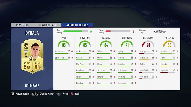 Теперь можно смотреть, как химия сказывается на отдельном игроке. В разделе «биография» видны базовые атрибуты, а также атрибуты, которыми игрок будет обладать при нынешней сыгранности. Например, Пауло Дибала имеет финишинг (способность завершить атаку) 84, но этот скилл может подняться до 94, если ему будет комфортно в коллективе.
