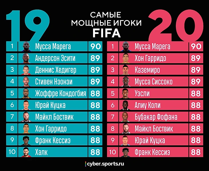 · Самый мощный прогресс в физике совершил француз Брайан Мбеумо из «Брентфорда» – с 32 в FIFA 19 до 60 в новой версии. При этом в прошлом сезоне вингер сыграл всего три матча. Видимо, остальное время он проводил в тренажерном зале.