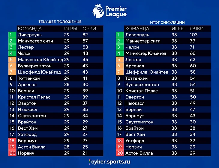 Здесь много интересного. «Ливерпуль» спустя 30 лет выиграл титул (103 очка!), «Сити» остался вторым (но Пеп взял Кубок). А вот «Лестер» посыпался и слил верную путевку в Лигу чемпионов. «МЮ» прилично помог Бруну Фернандеш – за 8 игр у него 2 гола и 6 ассистов.