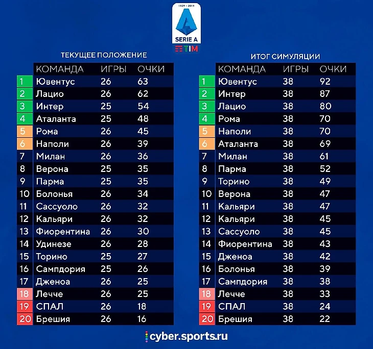 Чуда не случилось: «Лацио», который сейчас отстает от «Юве» на 1 очко, в итоге отстал на все 12, уступив второе место «Интеру». Зато туринцы вновь не смогли выиграть Кубок – его взял «Милан». Подкачала «Аталанта», которая в последних турах все-таки уступила место в Лиге чемпионов «Роме». Группа на вылет осталась без изменений: «Лечче», «СПАЛ» и «Брешия».