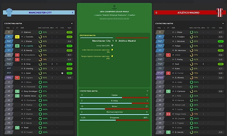 Лысый шарлатан из Манчестера наконец выиграл еврокубок без «Барселоны»: единственный гол в финале против «Атлетико» забил Лерой Сане. По дороге к финалу мадридский клуб выбил «Ювентус» и «Наполи», а «Сити» победил «Баварию» и «Аталанту».