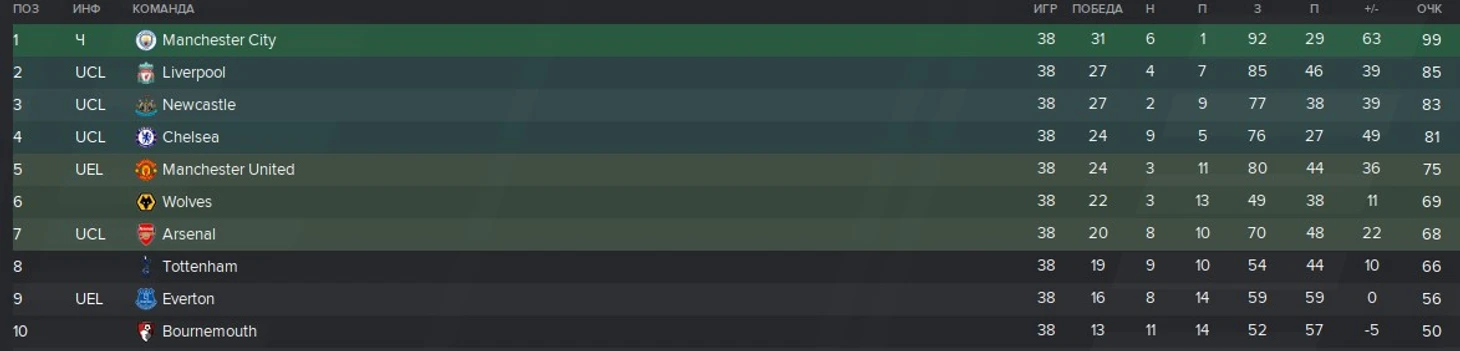 Второй сезон не стал сильно успешнее – 11-е место. И это при усилении в виде Деклана Райса, Сандера Берге и Виктора Осимхена (почти 200 млн евро в сумме). Шерингема уволили (странно, что не в первый сезон), а весь миллиард, что мы выделили команде, успешно слили. Его не хватило даже на еврокубки – о чемпионстве речи не шло.