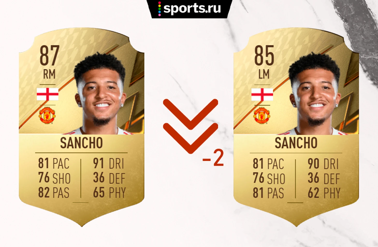 Джейдон Санчо с рекордной скоростью набивал голевые очки в Бундеслиге и перешел в «МЮ» звездой. На родине вингер столкнулся с большими трудностями: долго не мог сыграться с партнерами и выглядел медлительным. «Ман Юнайтед» верит в англичанина, но в симуляторе EA его уже подрезали до 85.