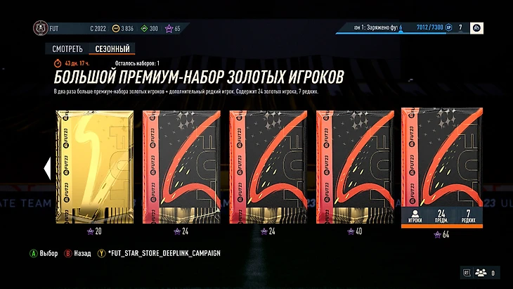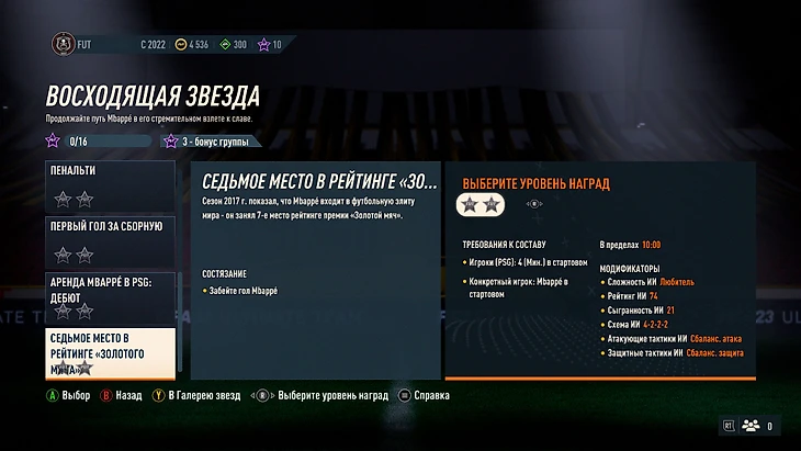 За выполнение сценариев начисляют звезды FUT. Награда будет выше, если выбрать повышенную сложность противника. В меню наград звезды обмениваются на наборы игроков и предметов. Большинство паков продаются.