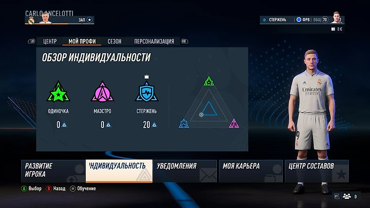 Еще лучше прокачали карьеру за игрока. Бесконечные мытарства против ботов теперь разбавляет глубокая персонализация футболиста. Принятые решения влияют на характер игрока. За каждое действие накапливаются очки индивидуальности, которые распределяются между тремя архетипами («Стержень», «Одиночка» и «Маэстро») и формируют личность футболиста. В игре также доступны покупки различных услуг и инвестиции.