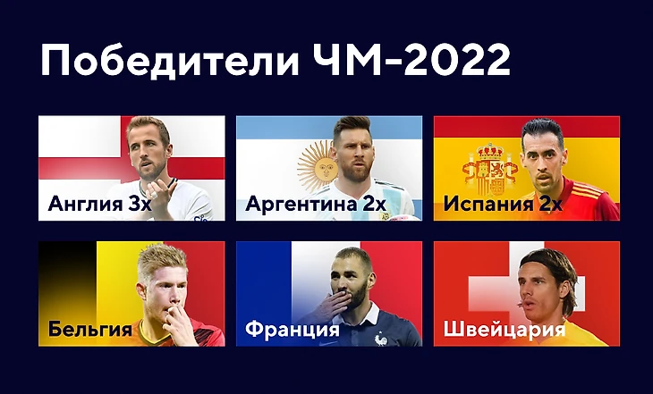 Англия трижды выиграла турнир и стала главным фаворитом ЧМ-2022 по версии Football Manager. На одну победу отстали сборные Аргентины и Испании, а неожиданной победе Швейцарии мы посвятили отдельный пункт текста – тот турнир получился уникальным. К огромному удивлению, звездная сборная Бразилии с Неймаром и Винисиусом за десять симуляций ни разу не вышла в финал. Это не ошибка – в реальности лидер рейтинга Эло выиграл чемпионат мира лишь раз.