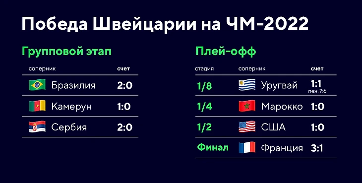 В первом матче плей-офф швейцарцы переиграли уругвайцев по пенальти. На этом чудном моменте их путь должен был прерваться, но в 1/4 финала им досталось Марокко, которая спаслась в добавленное время и прошла сборную Испании в серии пенальти. Следующим соперником Швейцарии стала сборная США, которая прошла команды Сенегала и Польши. Швейцарцы грамотно реализовали небольшое преимущество в классе и переиграли соперников с минимальным счетом – 1:0.