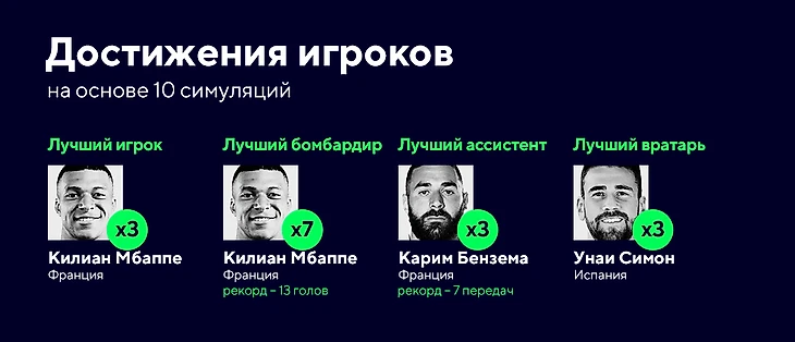 Один раз Килиан отметился эффективными передачами, но лучшим в подыгрыше оказался его партнер по сборной Франции Карим Бензема. Форвард «Реала» трижды стал лучшим ассистентом ЧМ и установил рекорд симуляций – 7 голевых передач. В топ лучших распасовщиков дважды попадали Лионель Месси и Лука Модрич.