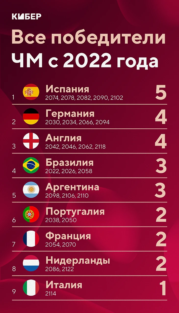 Теперь мы промотали ЧМ до юбилейного 2122 года и выяснили, какие сборные будут доминировать в ближайшее столетие.