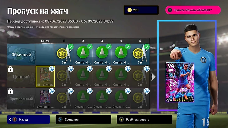 С тех пор игру заметно улучшили. В eFootball добавили цели и месячный «Пропуск на матч». Прогрессия получила 100 уровней и делится на «Обычный», «Ценный» и «Премиальный» ранги. Последние открываются за донат – 250 и 500 монет eFootball, хотя частично компенсируют потраченные средства. Задания гораздо проще, но радуют бонусами новичков. А еще появились дополнительные мандаты на игроков.
