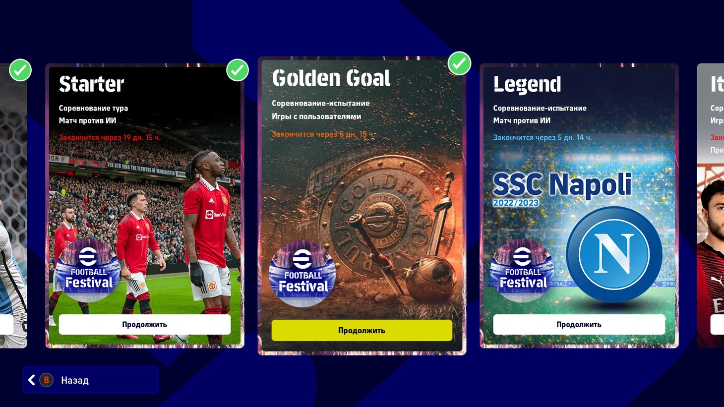 Отдельно выделим редкий турнир «Золотой гол». Его играют самостоятельно, зато матчи сами останавливаются после первого гола и сильно сокращают время на прокачку игроков. Не злоупотребляйте лазейкой во избежание возможных санкций от Konami, но несколько десятков матчей за событие вам точно не навредят.