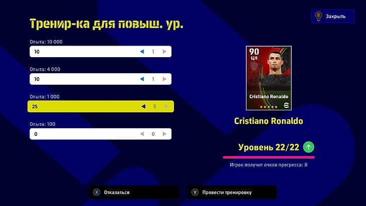 Программы тренировок получают в прогрессии «Пропуск на матч», различных заданиях и игровых турнирах, а также в подарок. Еще их можно купить в магазине за очки eFootball, но это слишком невыгодно.