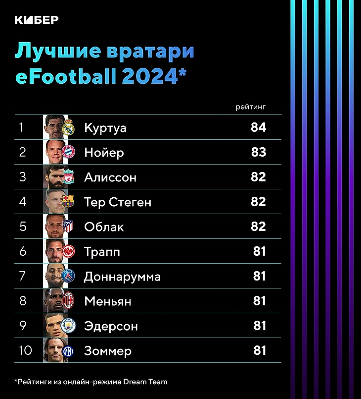 EFootball 2024 признал лучшим вратарем Тибо Куртуа из «Реала» (84). На второй строчке неожиданно остался Мануэль Нойер (83), рангом ниже оказались Алиссон, Марк-Андре тер Стеген и Ян Облак (все – по 82). В десятку заглянул Кевин Трапп из «Айнтрахта», а Ник Поуп и Эмилиано Мартинес не попали даже в расширенный топ-20 (по 79 баллов).