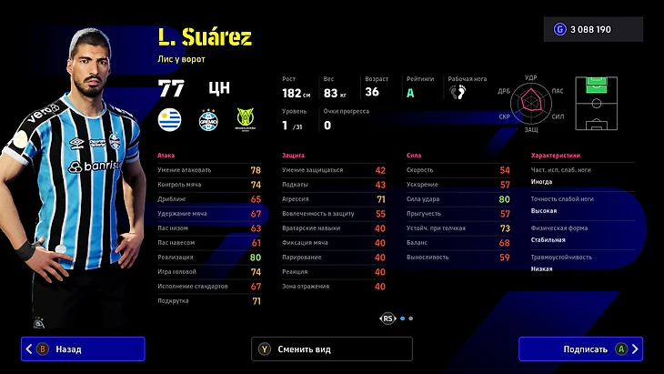 Konami подписала эксклюзивное соглашение с бразильской Серией А, поэтому в eFootball есть звезды лиги. Среди них – уругваец Луис Суарес, с этого года выступающий за «Гремио». Легендарный бомбардир потерял в скорости, зато сохранил высокую результативность и точные удары без подработки, а благодаря навыку «Боевой дух» не выключается из единоборств. Каждый гол Суареса подарит вам невероятные эмоции!