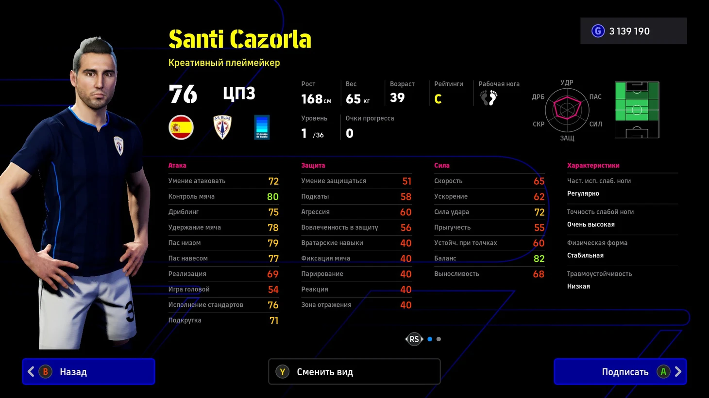 Санти Касорла неожиданно вернулся из Катара в Испанию, где подписался с «Реалом Овьедо» (он воспитанник клуба) на благотворительных условиях. Впечатляют даже базовые характеристики полузащитника, а фантастические навыки паса сделали из него отличного разыгрывающего. Но скорость лучше подкачать.
