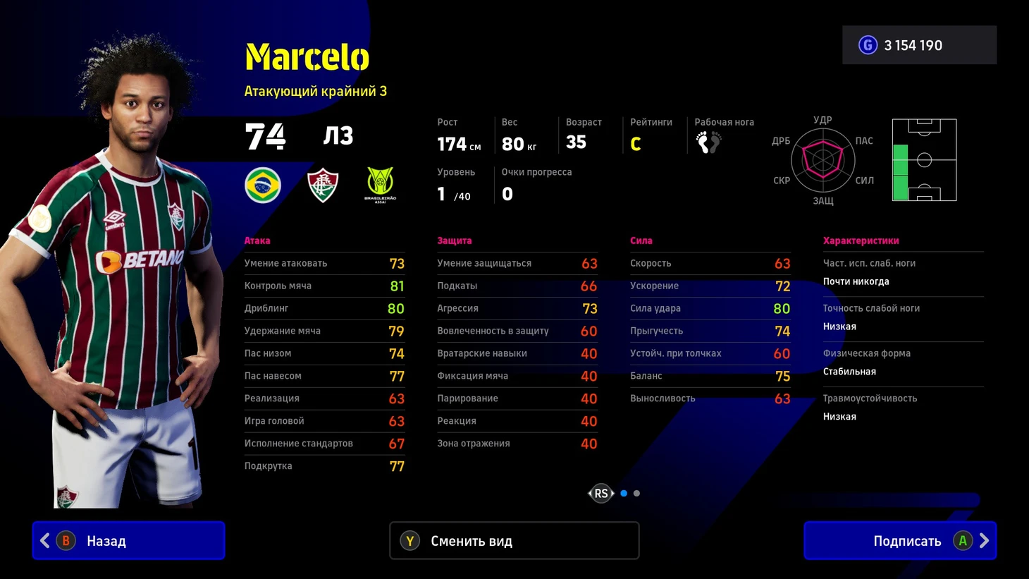После скомканного отрезка в «Олимпиакосе» бразилец Марсело вернулся на родину. Konami оставила ему контроль мяча и передачи на уровне топовых защитников игры, а вот скорость желательно подкачать на все 12 баллов. Марсело хорош в атаке, поэтому рассмотрите его как левого полузащитника. Его тонкий дриблинг – отдельное удовольствие.